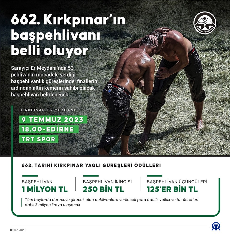 662. Tarihi Kırkpınar Yağlı Güreşleri’nde başpehlivan 1 milyon lira ödül kazanacak. Başpehlivan ikincisine 250 bin lira, başpehlivanlık üçüncülerine ise 125’er bin lira ödül verilecek.