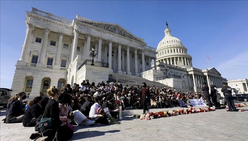 Kongre binası önünde toplanan ve kendilerini “Ateşkes Davetinde Bulunan Kongre Çalışanları” olarak isimlendiren bireyler, taarruzlarda ölen İsrailli ve Filistinli sivilleri andı.