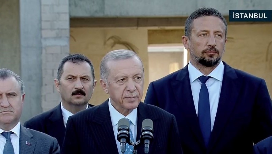 Cumhurbaşkanı Erdoğan, açıklamalarının akabinde gazetecilere basketbol topu ikram etti.