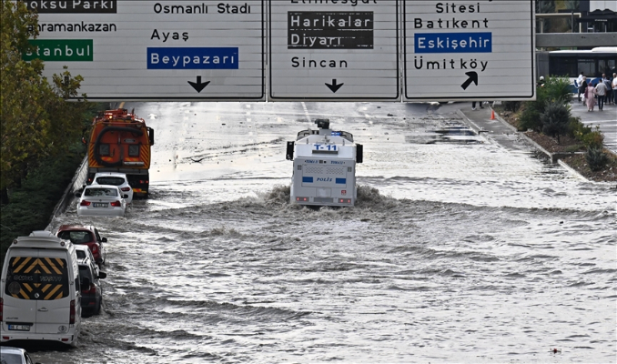 Ankara’da kısa süreli etkili olan sağanak ve dolu nedeniyle 15 Temmuz Kızılay Milli İrade Meydanı civarındaki yollarda su birikintileri oluştu.