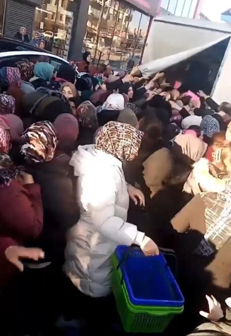 Bir kamyonetten dağıtılan bardakları alabilmek için toplanan vatandaşlar adeta birbirini ezdi.