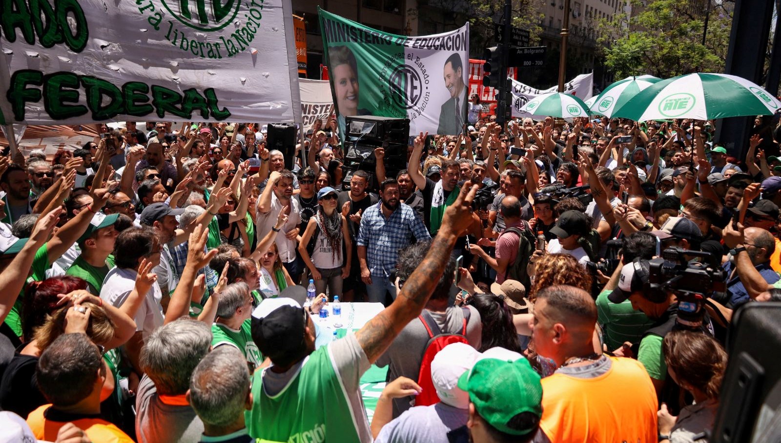 Başkent Buenos Aires’te, Arjantin’de Genel İş Konfederasyonu (CGT) davetiyle bir ortaya gelen yüzlerce kişi, Milei hükümetinin iktisat siyasetini protesto etti.