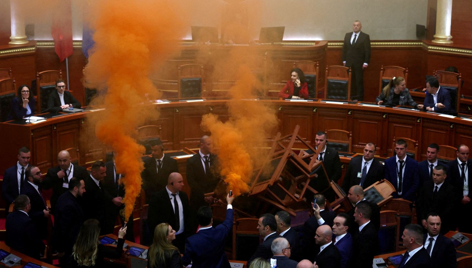 Daha evvel de farklı formüllerle meclis oturumlarını engelleyen ana muhalefetteki Arnavutluk Demokratik Partisi (PD) ve öbür muhalefet partilerinin milletvekilleri, bugün de sandalyeleri kürsünün önüne yerleştirip sis bombası ve maytap atarak oturumu engelleme teşebbüslerinde bulundu.