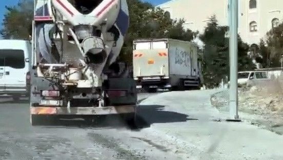 Görüntülerde yokuş çıkan mikserin cadde boyunca beton dökerek ilerlediği görüldü.