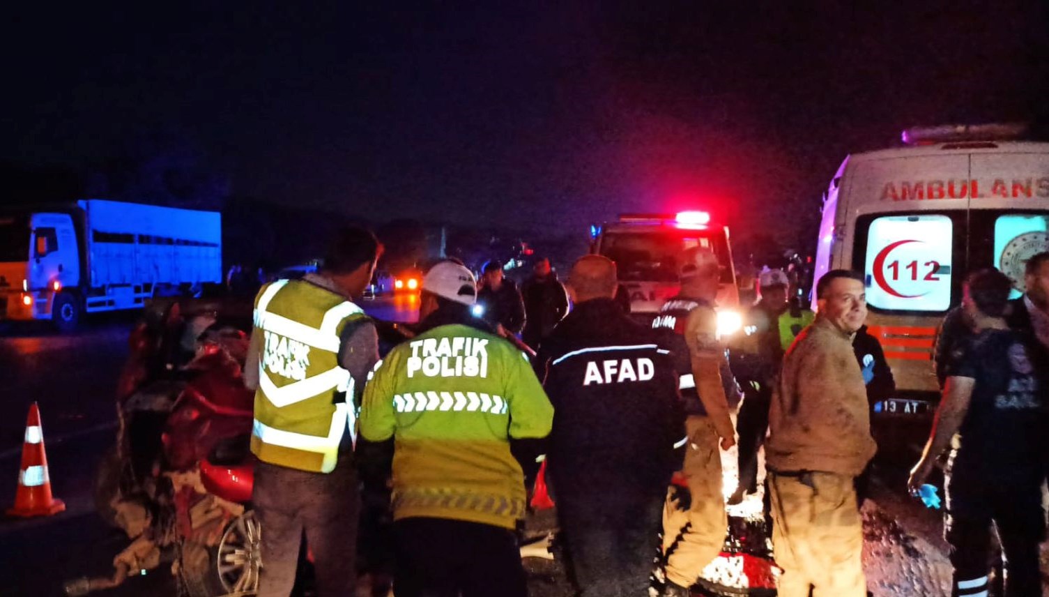 Bitlis-Tatvan kara yolunda, şoförlerinin kimliği şimdi belirlenemeyen araba, birebir güzergahtaki kamyona arttan çarptıktan sonra karşı taraftan gelen arabayla çarpıştı.