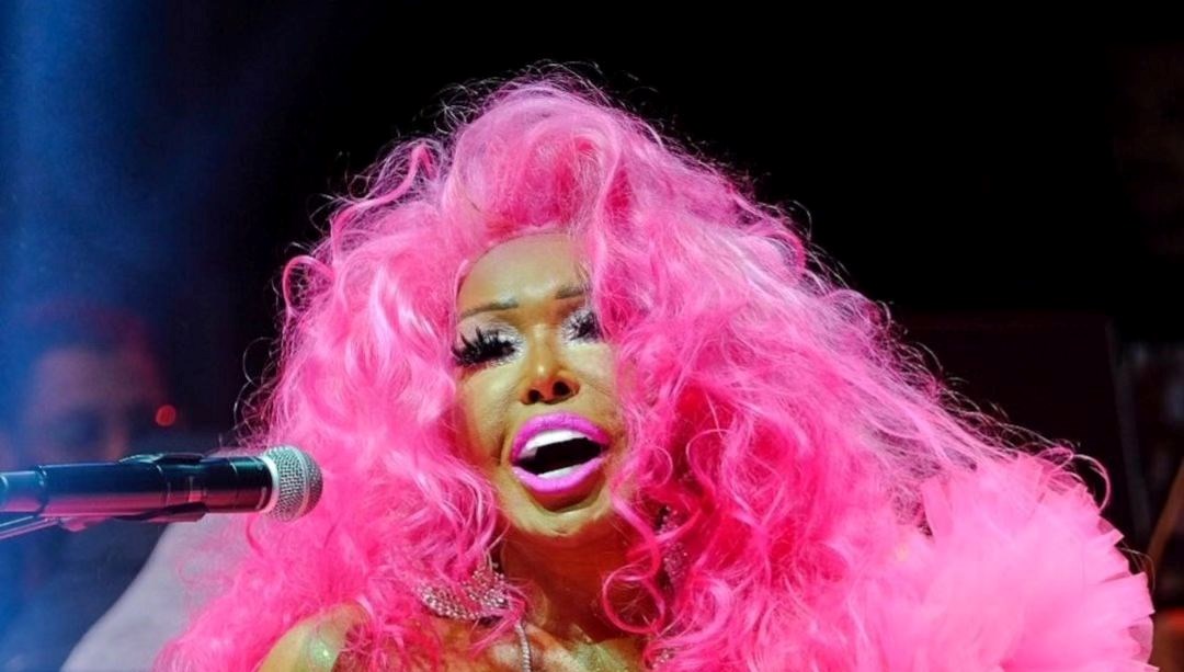 Sanatçı, pembe peruğu, pembe tonlarındaki makyajı ve pembe elbisesiyle sahnede uzunluk gösterdi.
