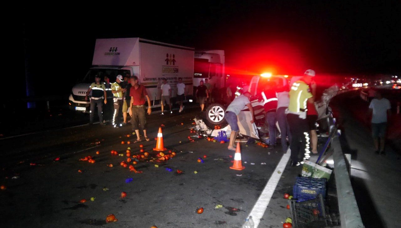 Kazanın tesiriyle savrulan kamyon daha sona tıpkı tarafta ilerleyen 35 EKS 068 plakalı yolcu otobüsüne ve 06 CKE 758 plakalı arabaya de çarptıktan sonra devrildi. Kamyonun kasasındaki domatesler yola savruldu.