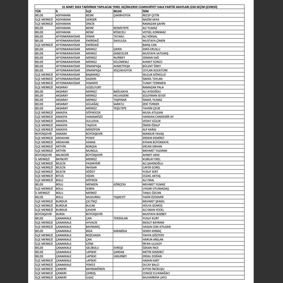 Parti Sözcüsü Deniz Yücel, partisinin 5 vilayetteki belediye lider adaylarını açıkladı. Akşam saatlerinde de CHP’nin öbür vilayet ve ilçe belediye liderleri açıklandı.
