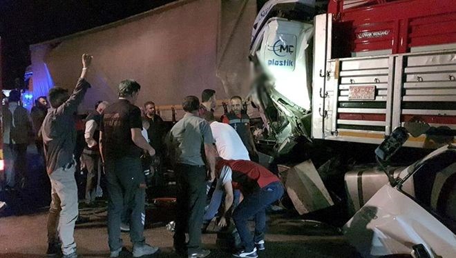 Sürücü TIR’ı yolun sağına çekti. Bu sırada tıpkı istikamete seyir halinde olan Selman Keşan yönetimindeki patoz yüklü TIR geriden çarptı. Kazayı gören öbür şoförler durumu polis, itfaiye ve sıhhat takımlarına haber verdi.