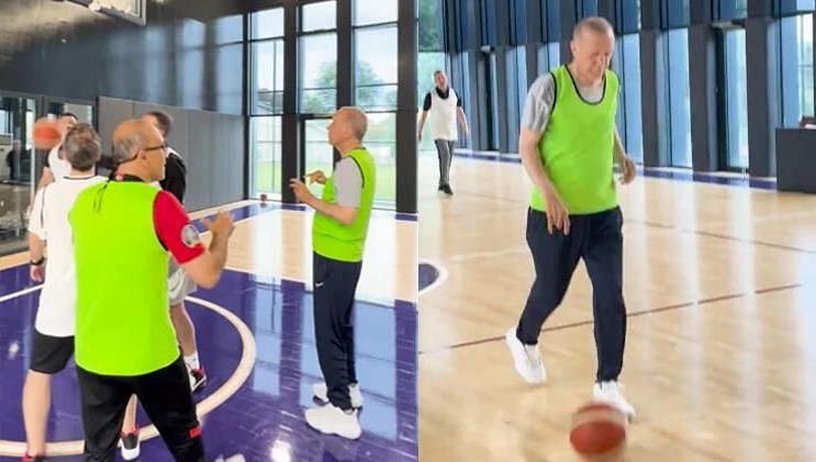 Videoda, Cumhurbaşkanı Erdoğan’ın top sürdüğü, pas verdiği, ve basket attığı anlar yer alıyor.