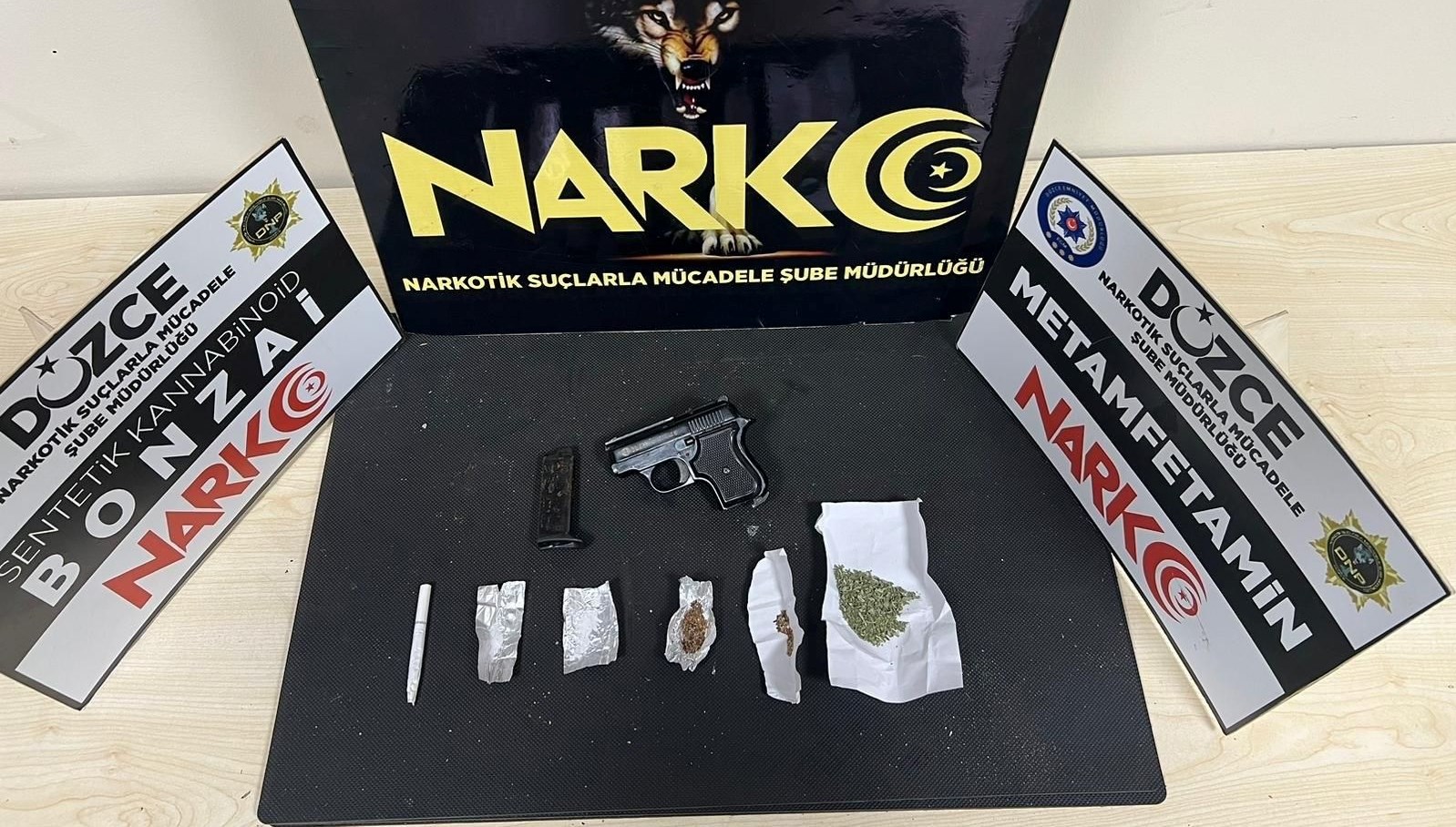 Yapılan uygulamalarda H.A., E.Y., F.K. ve O.K. yakalandı. Şahısların kaldıkları otel odası ve üzerlerinde yapılan kontrollerde 0,65 gram bonzai-metamfetamin karışımı, 2,30 gram sentetik kannabinoid (bonzai), 0,80 gram metamfetamin ve 7,65 milimetre ruhsatsız tabanca ele geçirildi. Şahıslardan 2’si tutuklanırken, 2 kişi ise isimli denetim kuralı ile özgür bırakıldı.