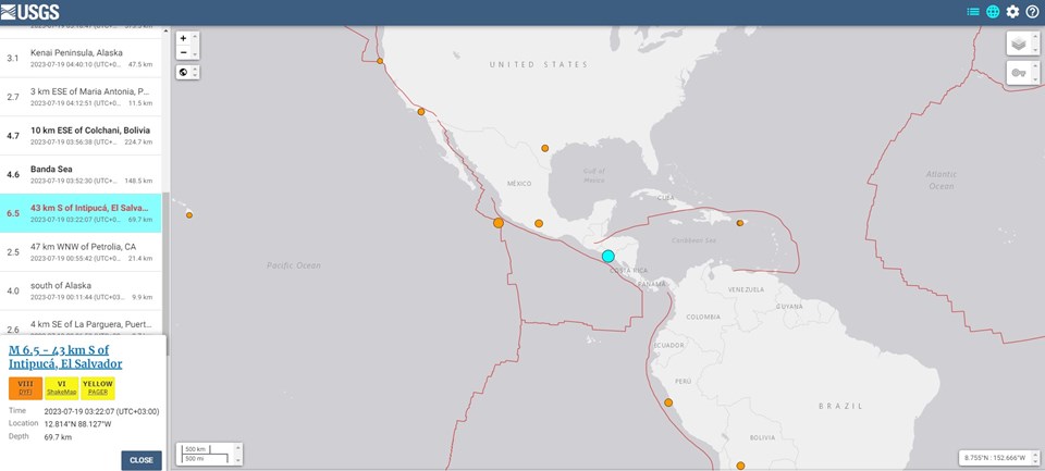 ABD Jeolojik Araştırma Merkezi (USGS), 6,5 büyüklüğündeki zelzelenin merkez üssünün, ülkenin Intipuca bölgesinin 43 kilometre güneyi olduğunu açıkladı.