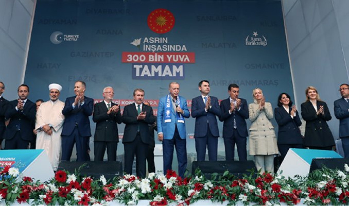 Ocak ayında 200, haziran ayında ise 250 bininci konutların depremzedelere teslim edildiğini hatırlatan Erdoğan, “Deprem bölgemizdeki 5 ilimizde Diyarbakır, Gaziantep, Kilis, Osmaniye ve Adana’da anahtarların çok önemli bir kısmı hak sahiplerine teslim edildi. Malatya, Kahramanmaraş, Hatay, Adıyaman, Şanlıurfa ve Elazığ’da çalışmalarımız son sürat devam ediyor. İşte bugün Malatya’da 300 bininci konutun anahtarını teslim ediyoruz. ‘Hükümet bu enkazın altında acaba ne zaman kalacak’ umuduyla tam 2 buçuk yıldır bekleyen deprem turistlerini işte bir kez daha hüsrana uğratıyoruz. Şunu da büyük bir gururla ifade etmek isterim bugün itibariyle deprem bölgesindeki her 3 hak sahibi vatandaşımızdan ikisini yeni yuvasına kavuşturmuş oluyoruz. Bugüne kadar 13 ilimizde 295 bin 929’u konut ve 8 bin 907’si iş yeri olmak üzere toplam 304 bin 836 bağımsız bölümü hak sahibi vatandaşlarımıza veriyoruz. İnşallah yılbaşına kadar deprem bölgemizde 453 bin bağımsız bölümü tamamlamak niyetindeyiz. Yeni evine, yeni iş yerine kavuşmamış tek bir vatandaşımız kalmayana kadar yılmadan, yorulmadan çalışacağız” dedi.