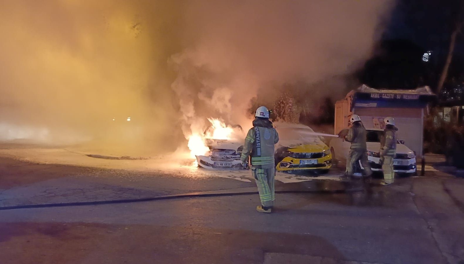 Kısa müddette büyüyen alevler, arabanın yanında park halindeki taksiye sıçradı.