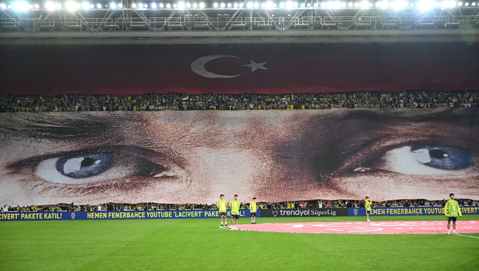 Fenerbahçe tribünleri “Cumhuriyet’in Feneri Aydınlatıyor Bizleri” pankartını da kale ardında açtı.