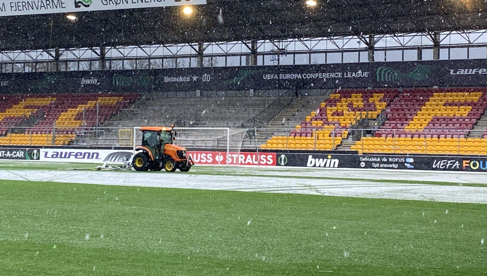 Danimarka’nın Farum kasabasında oynanacak müsabaka öncesinde başlayan kar yağışı sonrasında saha karla kaplanırken, Nordsjaelland kulübü yetkilileri, sentetik tabandaki karları temizledi.