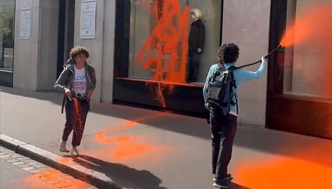 Fransa’da iklim aktivistleri, eserlerinin imalinde etrafa ziyan vermek ve devletten vergi kaçırmakla suçladıkları Louis Vuitton’un, Paris’in Şanzelize Caddesi’ndeki mağazasını sprey boyalarla boyadı.