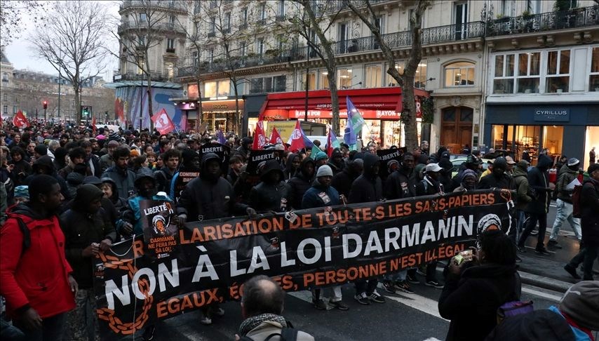 Bazı göstericiler İçişleri Bakanı Gerald Darmanin’in savunduğu göç tasarısına reaksiyonlarını dans ederek ve müzik söyleyerek gösterdi.