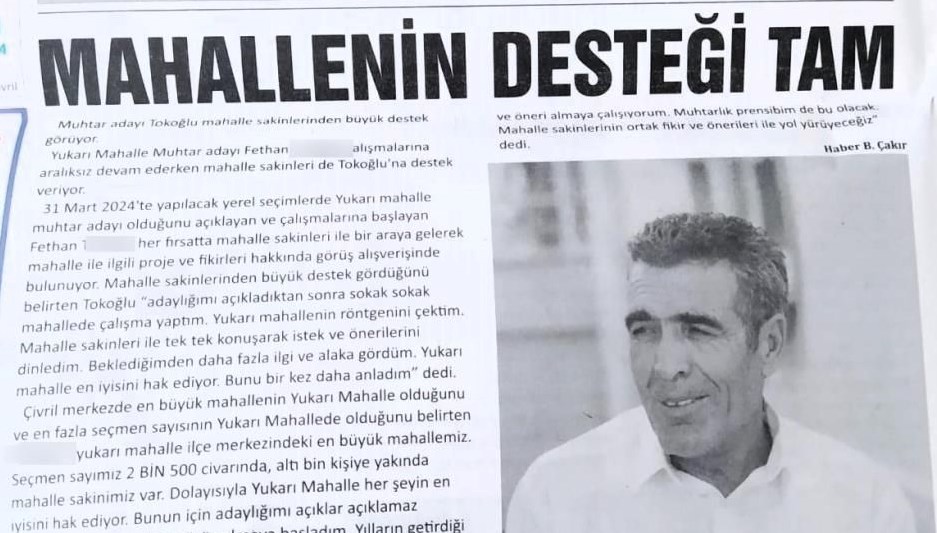 Çivril’de yayın yapan mahallî gazetenin dünkü sayısında, muhtar adayı Fethan A. ile yapılan röportaj “Mahallelinin takviyesi tam” başlığıyla yer aldı.