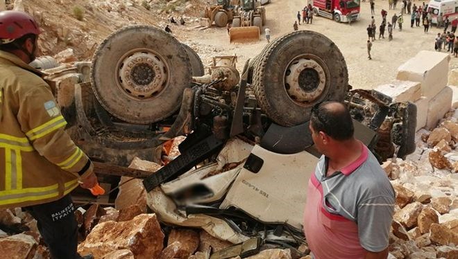 Maden firmasında çalışan Rahim Tandır idaresindeki hafriyat kamyonu, moloz dökümü sırasında kayarak metrelerce sürüklenip uçuruma devrildi. Şoför Tandır ile kamyonda bulunan Avni Baki araçta sıkışırken, ihbarla kaza yerine itfaiye, sıhhat ve jandarma grupları sevk edildi.