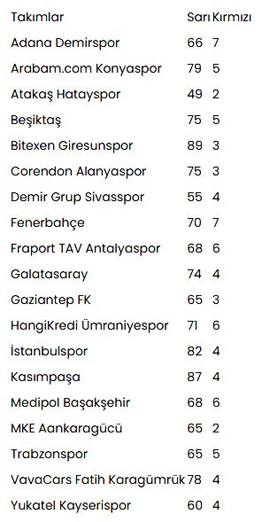 Süper Lig’de Galatasaray’ın şampiyonluğuyla sona eren dönemde hakemler 1341 sarı, 84 de kırmızı kart çıkardı. Ligde en fazla kırmızı kartı yedişer seferle Fenerbahçe ve Adana Demirsporlu futbolcular gördü.