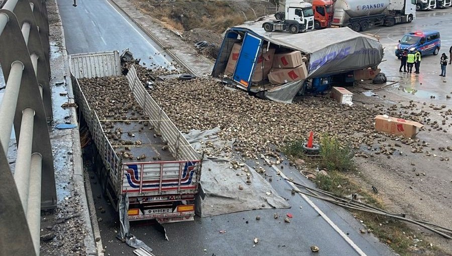 Karayolları takımları, kaza nedeniyle dorseden yola saçılan pancarları temizledi. TIR’lar, cazip yardımıyla bulundukları yerden kaldırıldı.