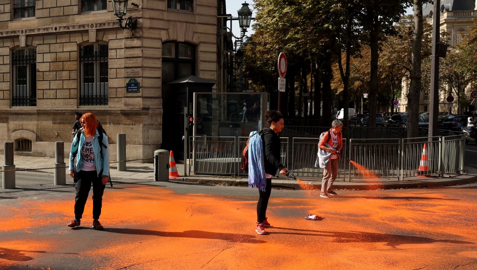 “Derniere Renovation” isimli iklim topluluğunu destekleyen 6 iklim aktivisti, turuncu boya spreylerini Elysee Sarayı yakınındaki meydana püskürttü. Hükümeti, iklim değişikliğine karşı gayret etmemekle suçlayan ve bu husustaki eylemsizliğine reaksiyon gösteren göstericiler, “Sizin suçlarınız, bizim ölülerimiz” yazılı tişört giydi.