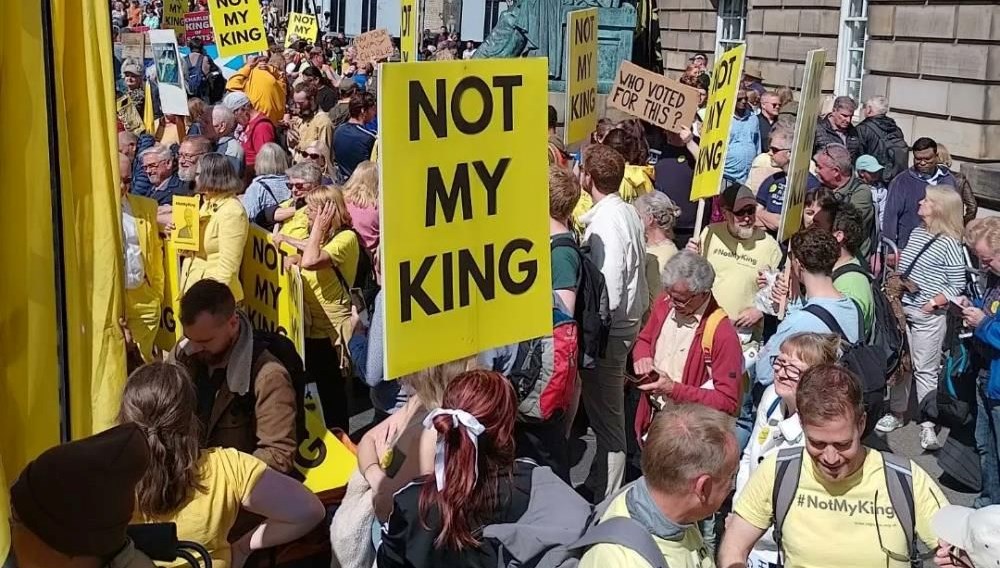 Kral Charles, başşehir Edinburgh’taki St. Giles Katedrali’ne gittiği sırada yol kenarında toplanan ve ellerinde “Benim hükümdarım değil” yazılı dövizler taşıyan monarşi aksileri tarafından protesto edildi.