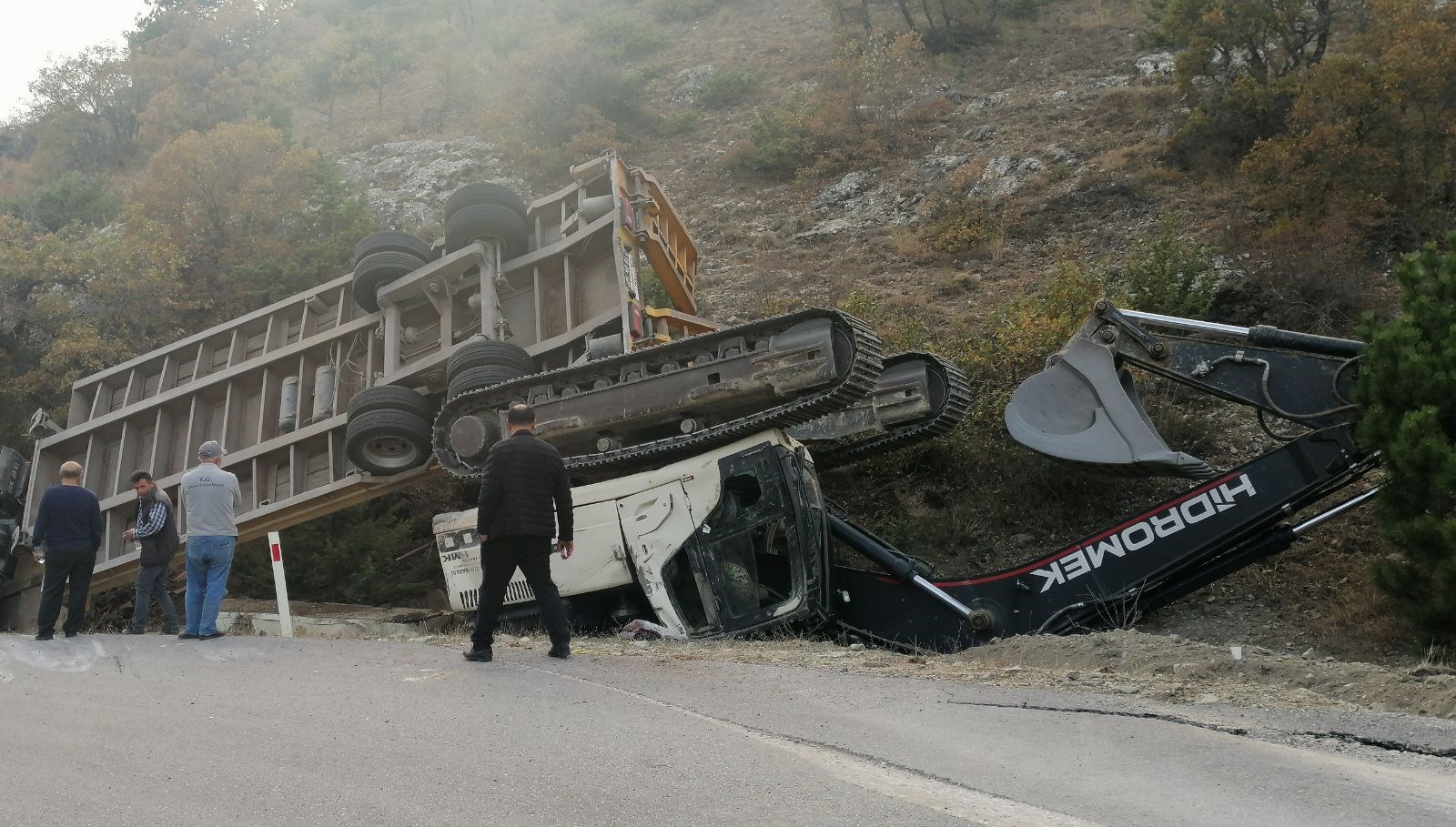 Rüstem Özdemir idaresindeki Vilayet Özel Yönetimine ilişkin iş makinesi taşıyan TIR, Peliközü köyü yakınlarında devrildi.