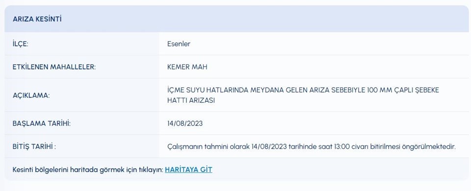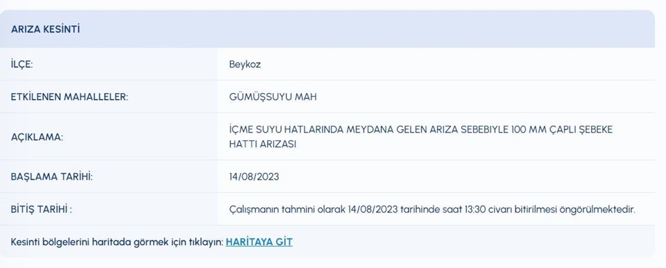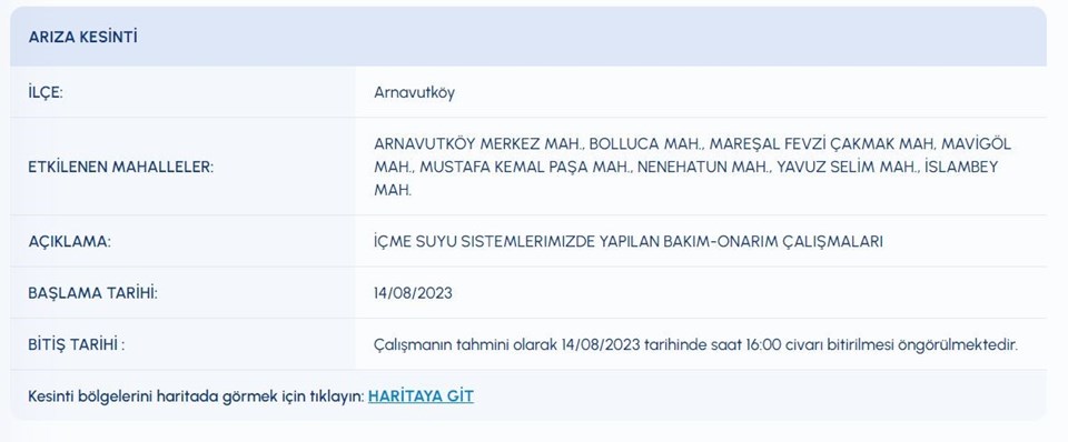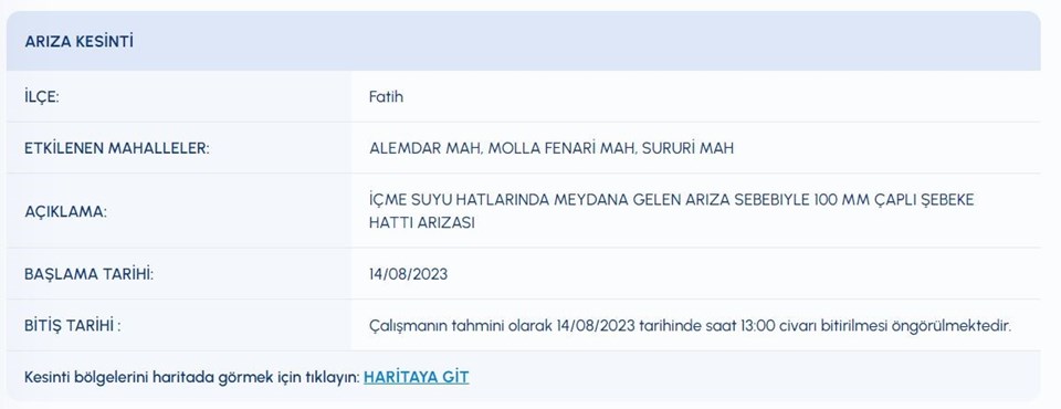 İSKİ (İstanbul Su ve Kanalizasyon İdaresi) planlı su kesintisi programını paylaştı. 14 Ağustos tarihli kesinti programına nazaran, Arnavutköy, Ataşehir, Esenler, Sultanbeyli, Beykoz, Fatih’in birtakım mahallelerine su verilemeyecek. Pekala, kesinti listesindeki içelerde sular ne vakit gelecek?