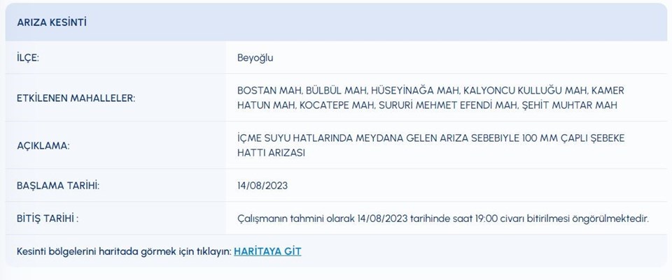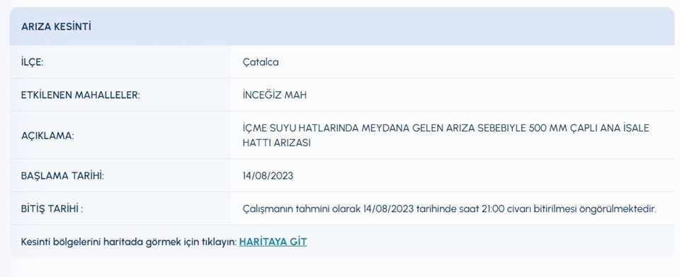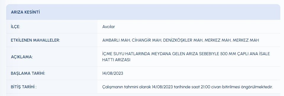 İSKİ (İstanbul Su ve Kanalizasyon İdaresi) planlı su kesintisi programını paylaştı. 14 Ağustos tarihli kesinti programına nazaran, Avcılar, Beyoğlu, Çatalca, Maltepe’nin birtakım mahallelerine su verilemeyecek. Pekala, kesinti listesindeki içelerde sular ne vakit gelecek?