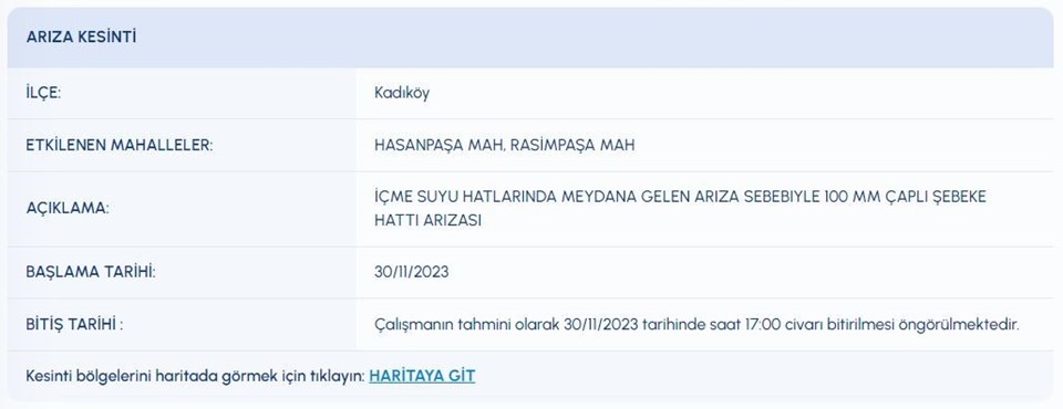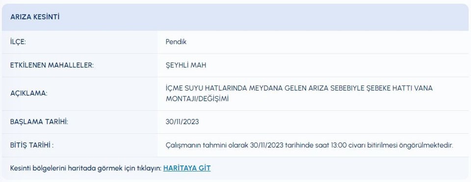 İstanbul Su ve Kanalizasyon Yönetimi (İSKİ) tarafından yayımlanan duyuruyla birlikte, İstanbul’un 7 ilçesinde su kesintisi yapılacağı açıklandı. Arnavutköy, Başakşehir, Çatalca, Kadıköy, Kağıthane, Pendik, Tuzla ilçesinde yer alan kimi mahallelerde yaşanacak olan su kesintisi nedeniyle su verilemeyecek.