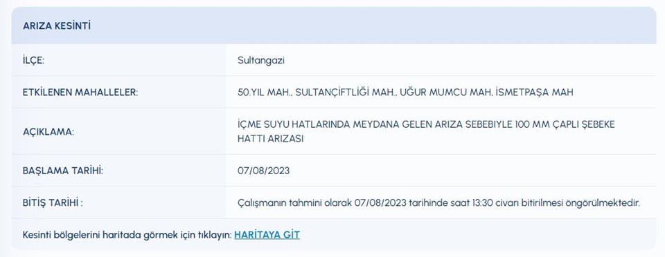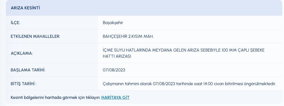İSKİ (İstanbul Su ve Kanalizasyon İdaresi) tarafından paylaşılan su kesintisi programına nazaran, Başakşehir ve Sultangazi ilçelerinde belli saat aralıklarında su kesintisi yaşanacak.
