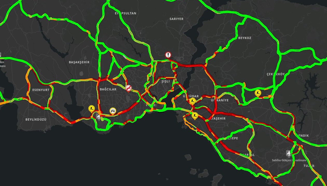 İstanbul Büyükşehir Belediyesi Trafik Yoğunluk Haritası’na nazaran kent genelindeki trafik yoğunluğu Avrupa Yakası’nda yüzde 83, Anadolu Yakası’nda ise yüzde 89’a ulaştı.