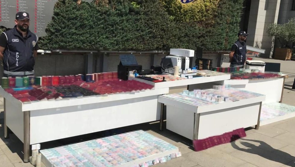 Söz konusu adreslerde yapılan aramalarda ise çeşitli ülkelere ilişkin 2 bin 396 geçersiz kimlik, farklı ülkelere ilişkin 365 geçersiz pasaport, 202 geçersiz vizeler, farklı ülkelerin hudut kapılarına ilişkin 844 giriş-çıkış silikon mührü, ülke giriş çıkış evrelerinde kullanılan 11 damga, Istampalar mor ışık aygıtları, dizüstü bilgisayarlar, bir çelik kasa, 16 bin 600 lira, 9 bin 590 dolar, 19 bin 975 euro para ele geçirildi.