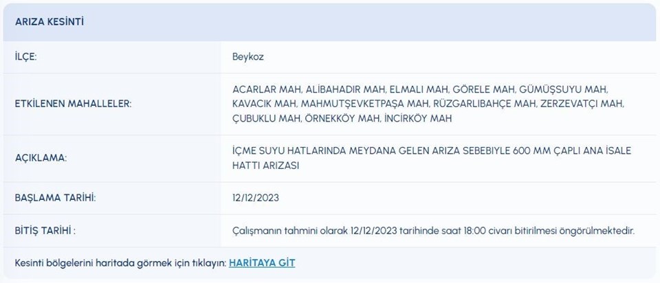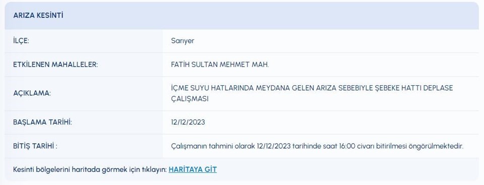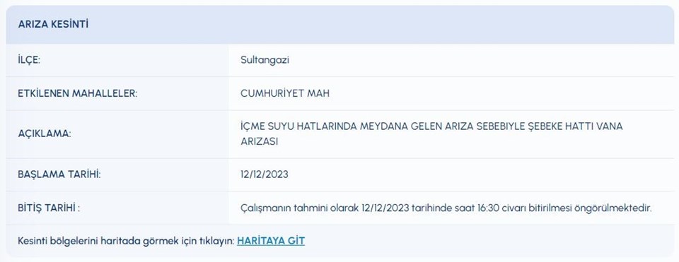 İSKİ (İstanbul Su ve Kanalizasyon İdaresi) planlı su kesintisi programını paylaştı. 12 Aralık tarihli kesinti programına nazaran, Beykoz, Sarıyer, Sultangazi’nin kimi mahallelerine su verilemeyecek. Pekala, Bağcılar, Maltepe, Şile ve Ümraniye’de sular ne vakit gelecek?