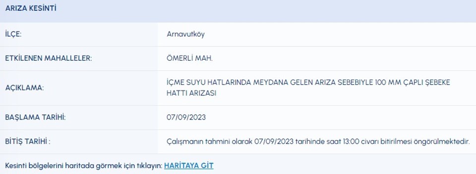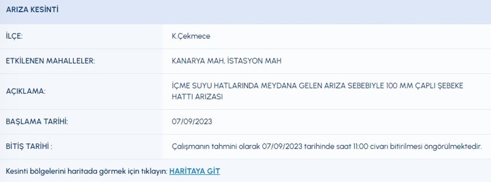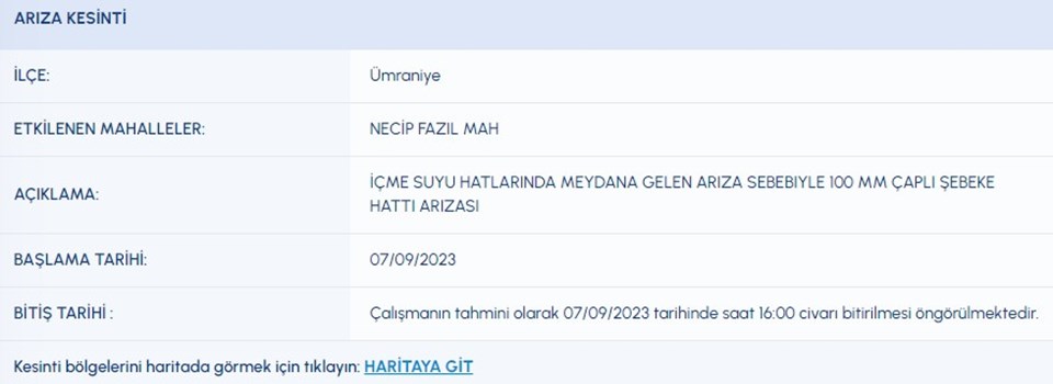 İSKİ (İstanbul Su ve Kanalizasyon İdaresi) planlı su kesintisi programını paylaştı. 7 Eylül tarihli kesinti programına nazaran, Arnavutköy, Maltepe, Küçükçekmece ve Ümraniye’nin birtakım mahallelerine su verilemeyecek. Pekala, Arnavutköy, Maltepe, Küçükçekmece ve Ümraniye’de sular ne vakit gelecek?