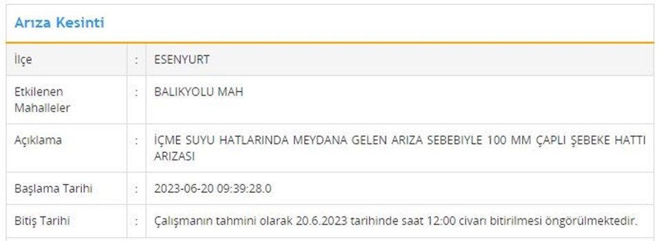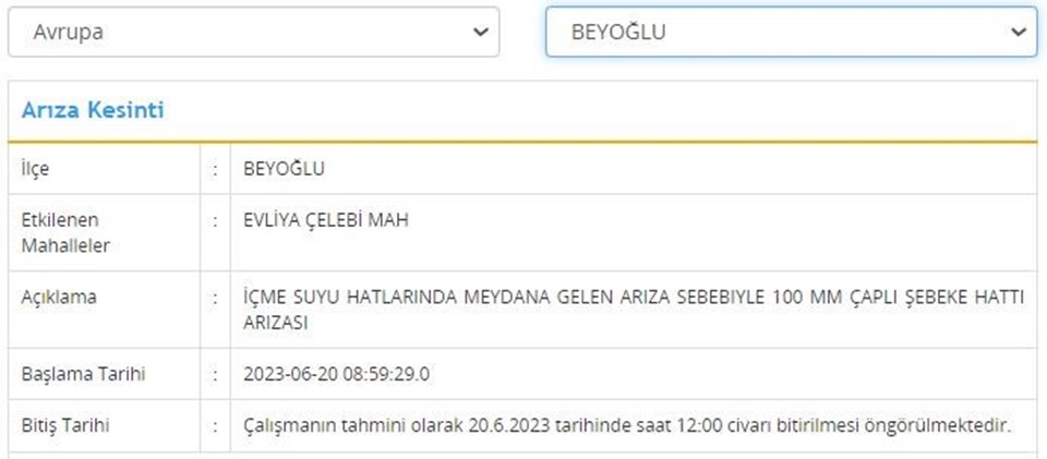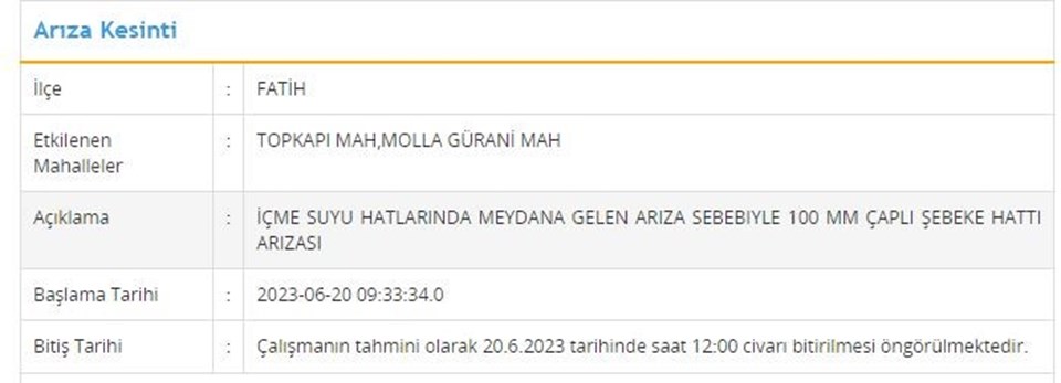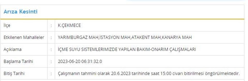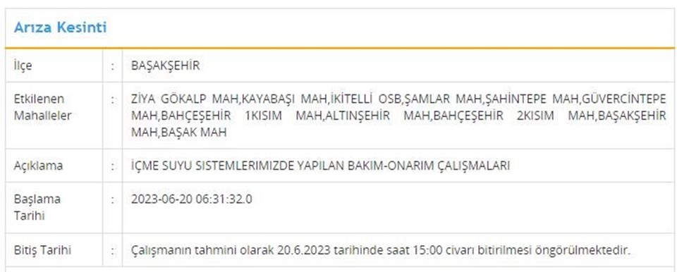 20 Haziran tarihli programa nazaran; Arnavutköy, Başakşehir, Küçükçekmece, Beyoğlu, Esenyurt, Fatih ilçelerinde muhakkak saat aralıklarında su kesintisi yaşanacak.