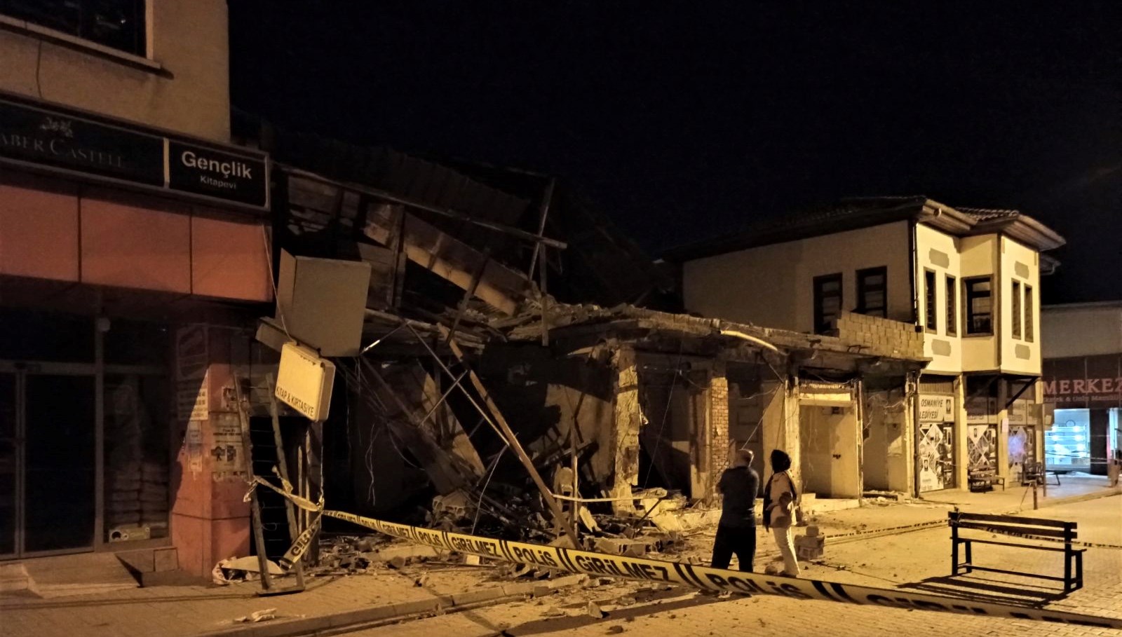 Alibeyli Mahallesi Cevdet Sunay Caddesi’nde, Kahramanmaraş merkezli zelzelelerde ağır hasar aldığı belirtilen iki katlı bina çöktü.