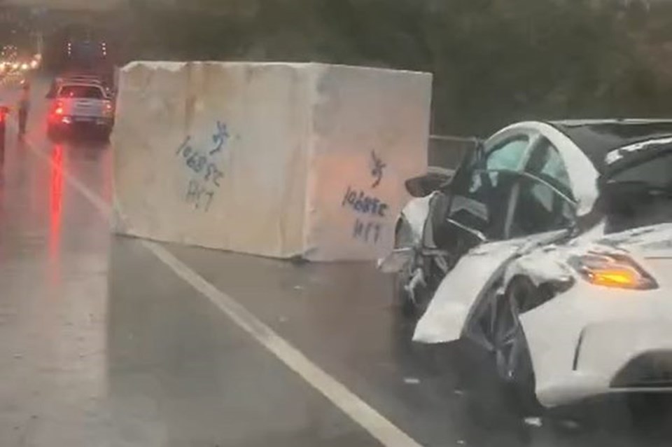 Aracın sol tarafını ezip geçen mermer blok yol ortasında kaldı. Hasar alan lüks araba de kullanılamaz hale geldi.