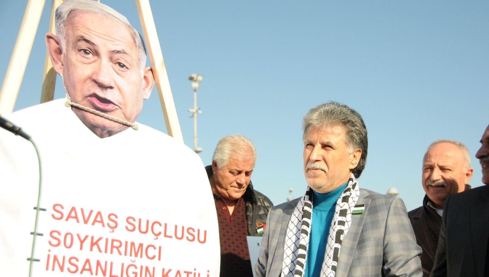 Programda, İsrail Başbakanı Binyamin Netanyahu’nun maketi temsili olarak idam sehpasında asıldı.