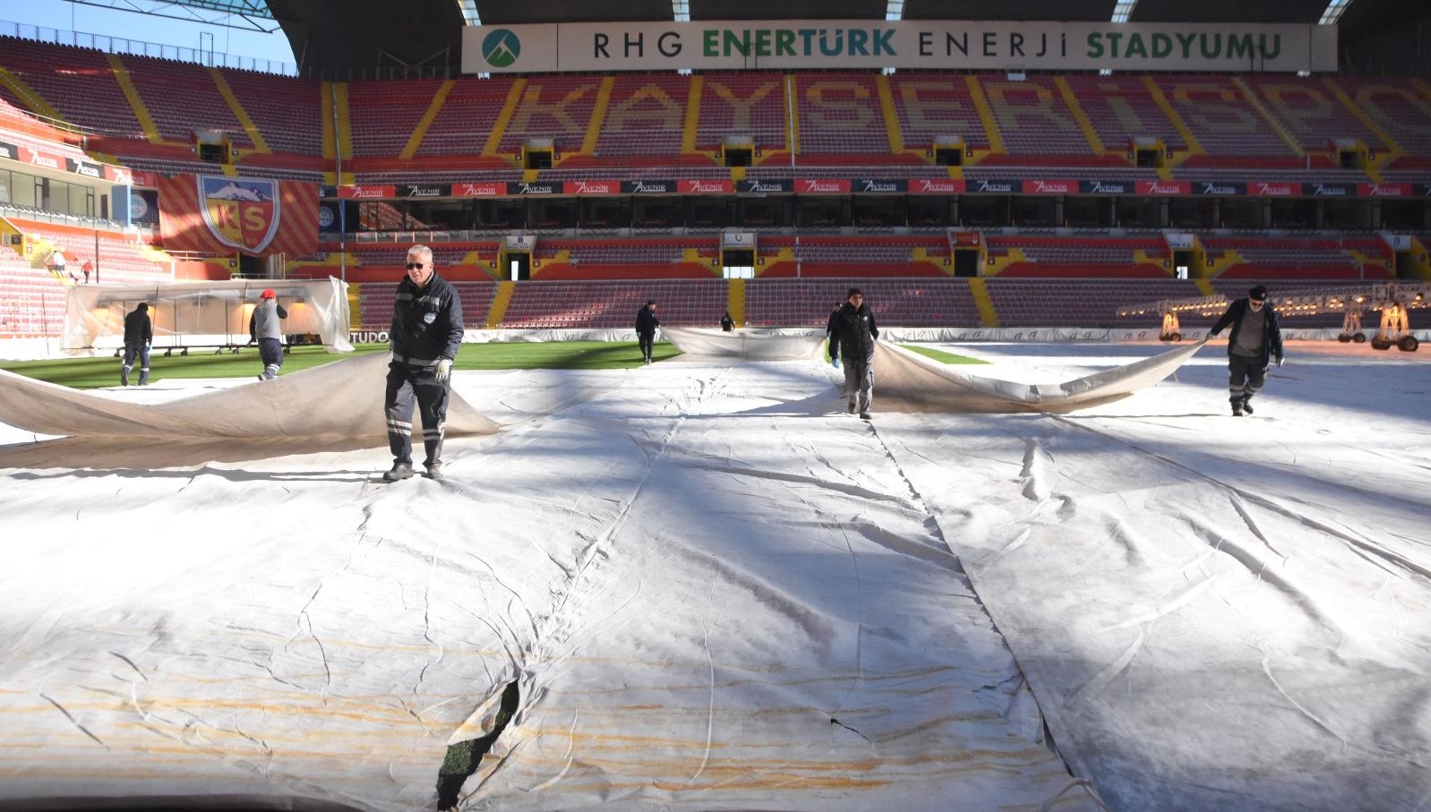 Çalışmalarla ilgili bilgi veren stadyum müdürü Ali Yılmaz, “Önemli bir maç var. Fenerbahçe maçı öncesi alanımızda ufak tefek dertlerimiz vardı. Onları gidermek için kale önlerinde değişim çalışması yaptık. Genel tohum çalışması gerçekleştirdik. Hava soğuk olduğu için örterek tohumları erken patlatma çalışması yaptık. Sonucunu de aldık. Alanımızı da soğuk havadan korumak için özel örtü ile çimlerin üzerini örttük. Maç günü son hazırlıklarımızı tamamlayacağız. Ağır bir bakım çalışması yaptık. Maç günü de deseni verip, biçimini yapacağız. Maç günü hoş bir yer ortaya çıkaracağımızı düşünüyorum.” sözlerini kullandı.