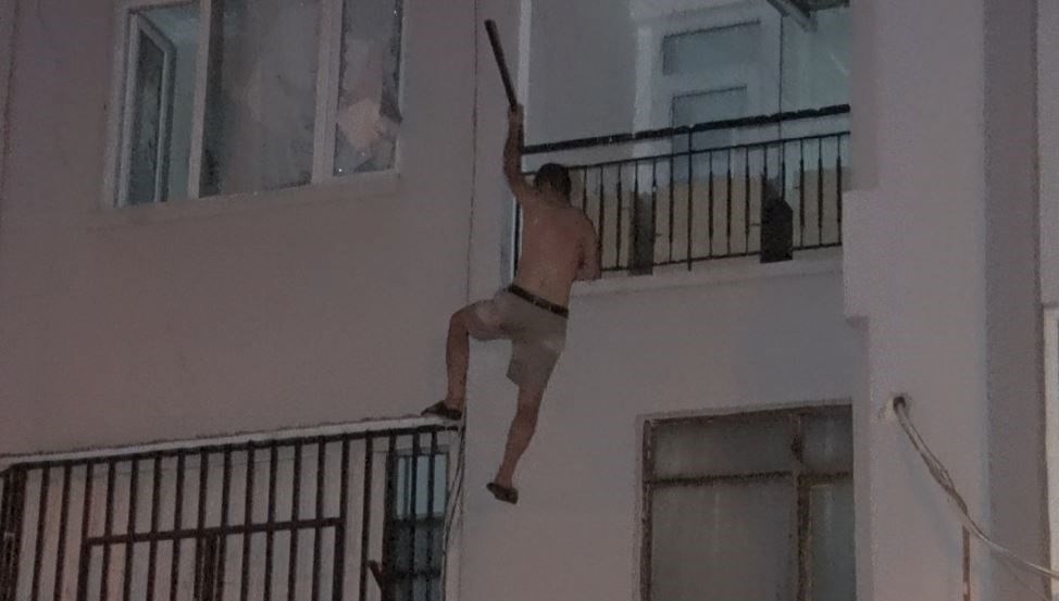 Şahıs, elindeki bıçak ve cam üzere kesici aletlerini boğazına dayadı, konutunun camlarını kırdı, birtakım eşyaları yola fırlattı. Sağa sola bağırarak polislerin kendisine bağlantı kurmasına müsaade vermedi. Polislerin ikna çalışması içerden devam ederken, şahsı tanıyanlar da olay yerine geldi.