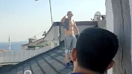 Merkez Mahallesi’nde üstü çıplak bir kişi, kentsel dönüşüm kapsamında boşaltılan 4 katlı binanın çatısına çıktı.