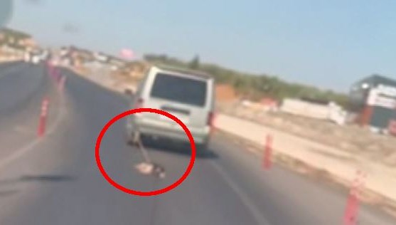 Gaziantep-Nizip karayolu üzerinde hafif ticari araç şoförü, bir köpeği aracının gerisine iple bağlayıp sürükledi.