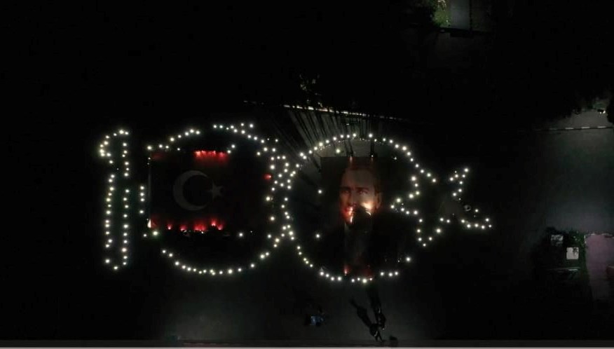 Yurdun bahçesinde ışıkları kullanarak “100. Yıl” yazısı oluşturan öğrenciler, Türk bayrağı ve Atatürk posteri açtı. Bu manalı günde oluşturulan görsel koreografi, izleyenlere unutulmaz anlar yaşattı.