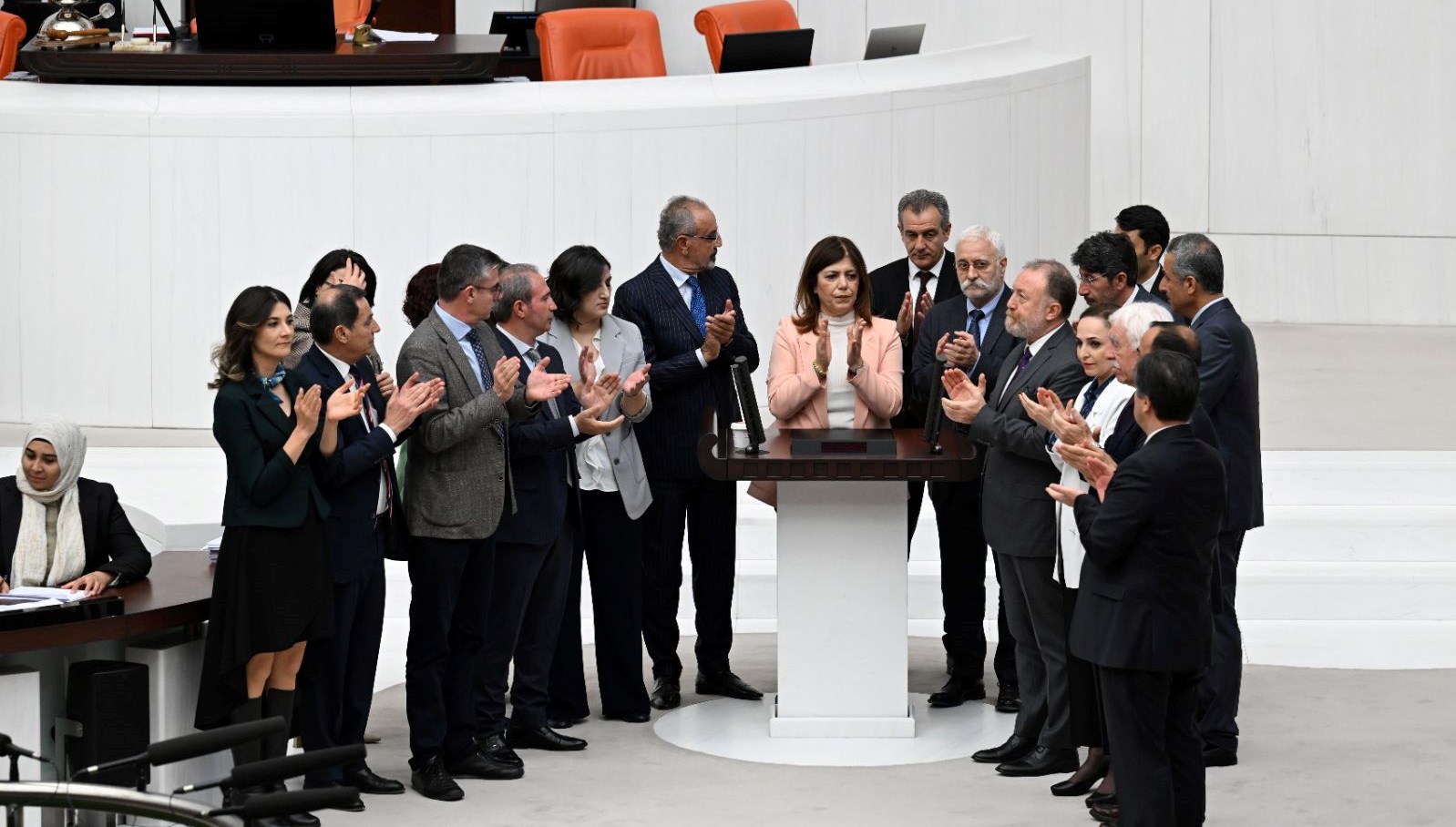 Bozdağ’ın görüşmelere devam edileceğini yinelemesi üzerine HEDEP milletvekilleri kürsü etrafında toplandı.