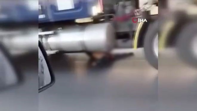 TIR şoförünün durumu fark etmeyerek aracını kullanmaya devam etmesiyle hırsızın vücudu araçla birlikte kilometrelerce sürüklendi.