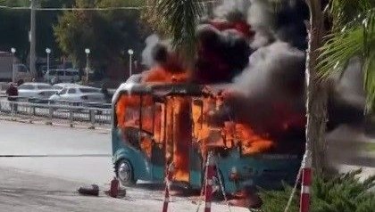 Mersin’in merkez Akdeniz ilçesi üzerinde öğlen saatlerinde çarşı istikametine seyir halinde olan bir minibüs, ön taraftan yanmaya başladı.