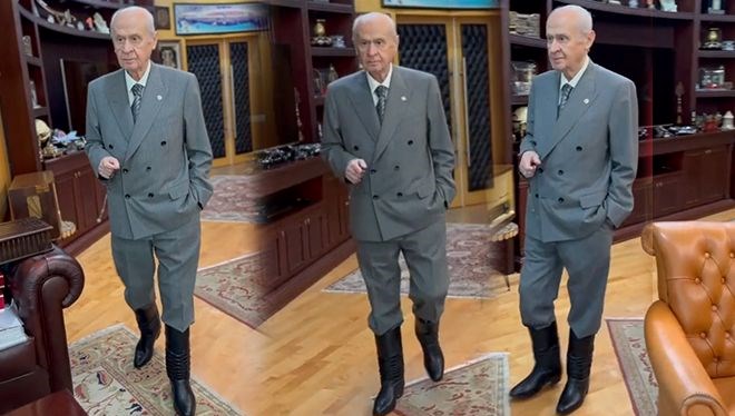 MHP’nin paylaşımındaki görüntüde MHP Genel Lideri Devlet Bahçeli, elinde tespihi, ayağında çizmeleriyle, Zeki Müren’in “Ağlama Sevdam” müziği eşliğinde yürürken görülüyor.